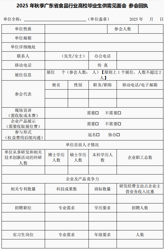 附:2025年秋季广东省食品行业高校毕业生供需见面会 参会回执