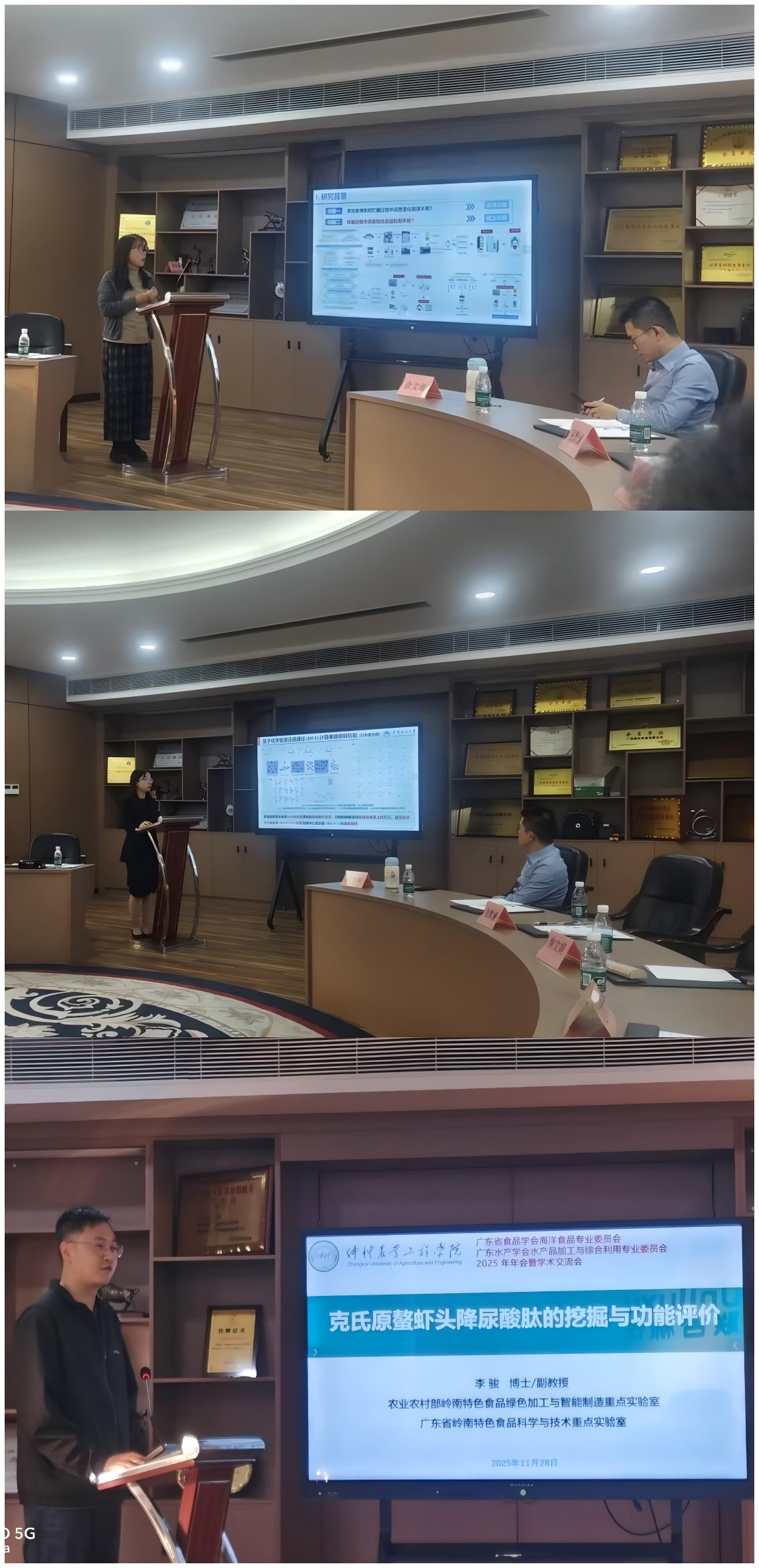 学术交流环节,邀请了仲恺农业工程学院李骏副教授、南海所相欢副研究员、华南理工大学张默澜助理研究员分别作了《克氏原螯虾头降尿酸肽的挖掘与功能评价》、《罗非鱼烤制过程中品质形成机制解析及即热产品开发》、《海藻多糖的高效制备及功效机理研究》的学术报告,为水产品精深加工与高值化利用提供了重要指导和技术支撑。